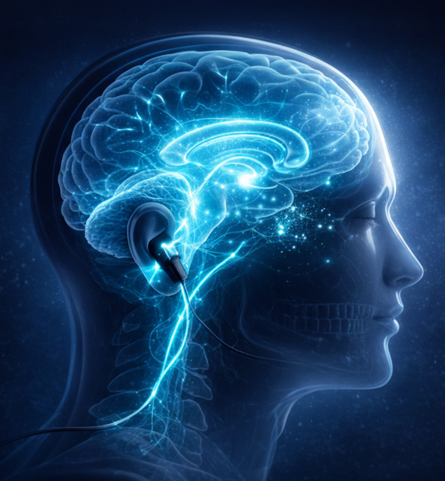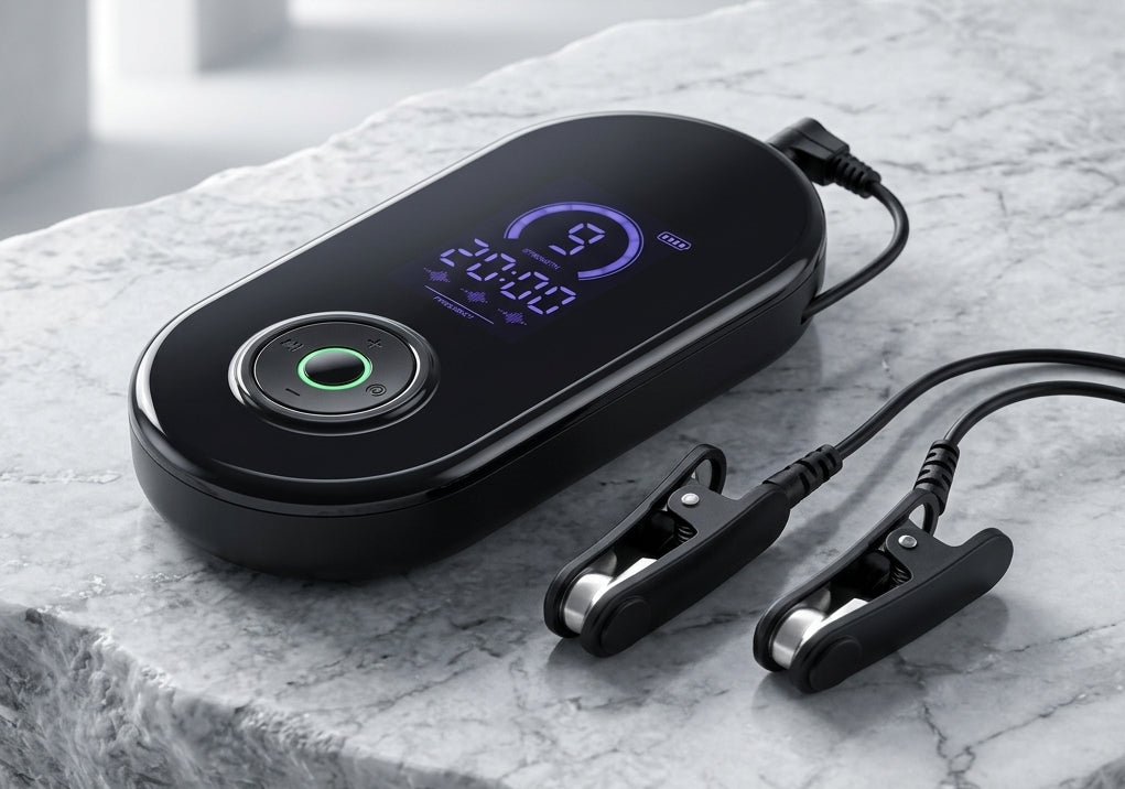La Stimulation Électrothérapeutique Crânienne (CES) envoie de micro-courants indolores via les clips auriculaires. Ces signaux stimulent le nerf vague et régulent l'activité électrique du cerveau, favorisant la transition des ondes Bêta (stress) vers les ondes Alpha (relaxation).